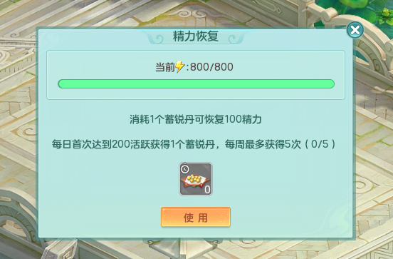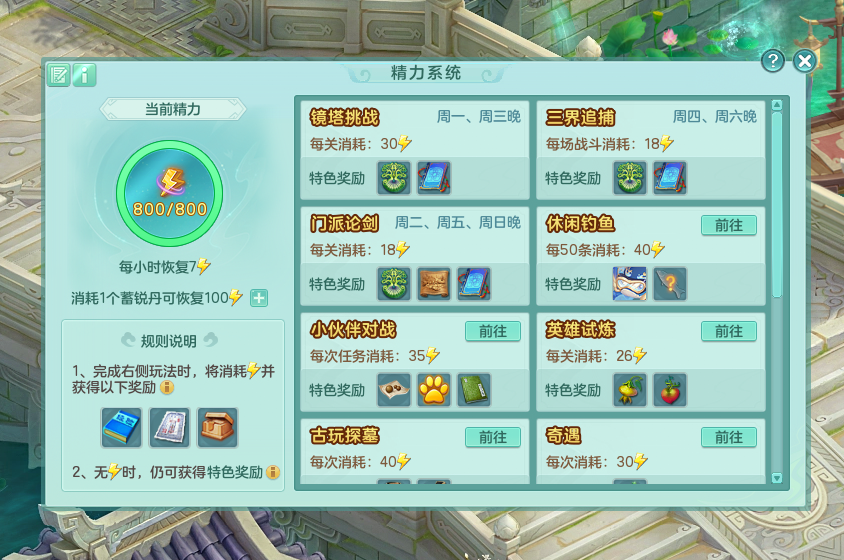 如果精力耗尽,少侠仍可获得部分特定奖励,而消耗掉的精力值不仅会随时间恢复(精力恢复不需要游戏在线),在每周达到一定活跃时,还能获得蓄锐丹,可以自由选择使用时机补充精力。蓄锐丹能让大家有一部分可以自己支配的精力,方便安排时间。
