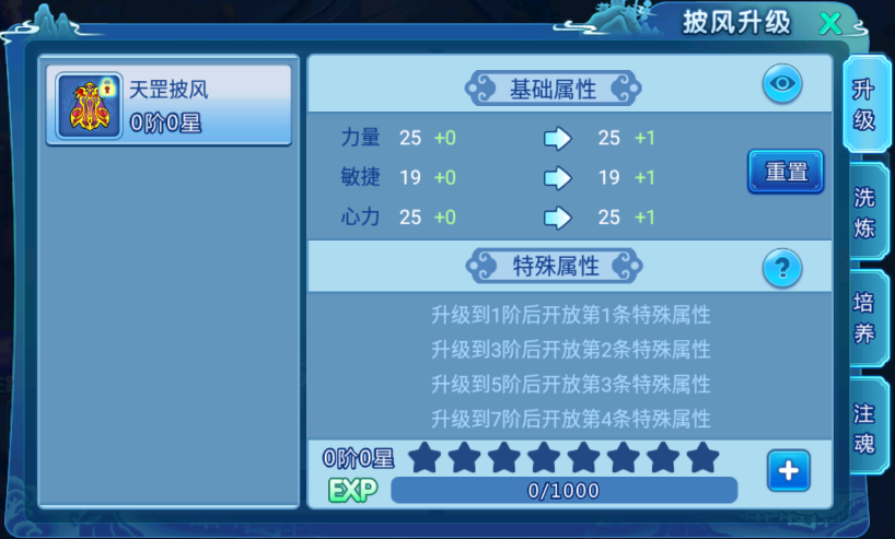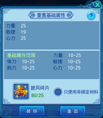 披风基础属性可以利用披风碎片重置,重置会从力量、体力、敏捷、耐力、心力中随机抽取1-3条属性和属性值,且属性不为重复;披风升级需要利用披风或披风碎片进行升级;