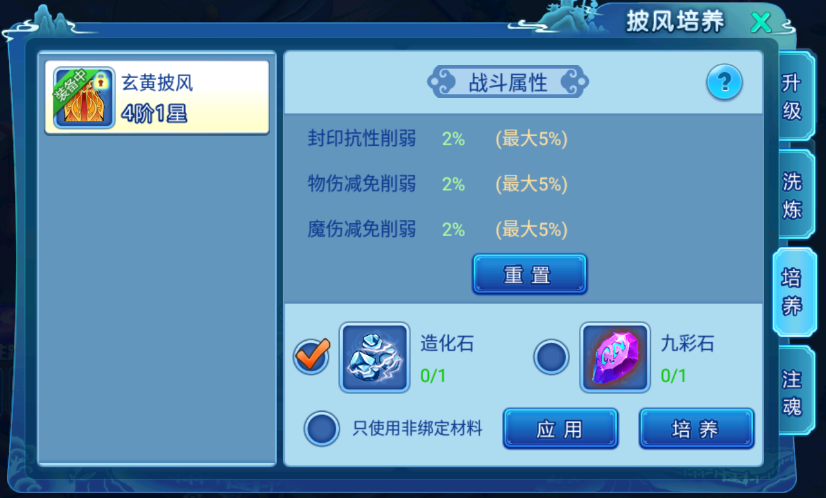 披风战斗属性需要披风到4阶1星解锁,解锁时会随机生成3条属性,战斗属性可以利用造化石和九彩石培养属性,造化石需要手动保存结果并且会出现增加、减少、不变3种结果,而九彩石是自动保存结果固定增加0.1%的属性;
