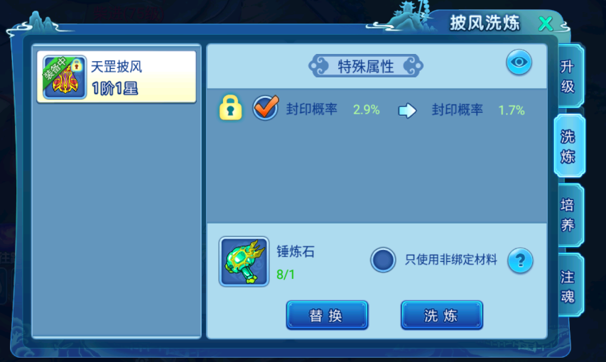 特殊属性需要利用锤炼石洗炼,每一条特殊属性需要单独进行洗炼,勾选后洗炼即可,洗炼后属性类型和数值都会重新随机生成,可以自主选择是否替换,如果选择其他属性洗炼是,有未替换的属性会直接将其情况;