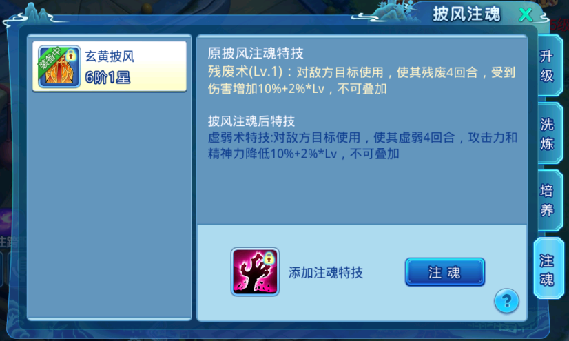 注魂功能需要披风6阶1星解锁;注魂特技可以通过无限挑战30层后每10层随机获得一个,或者通过庆典抽奖活动获得注魂特技自选礼包;新注魂可以覆盖旧注魂,注魂等级是和披风等级有关的,披风6阶1星时注魂等级为1级,披风每升星注魂特技就会自动升1级;