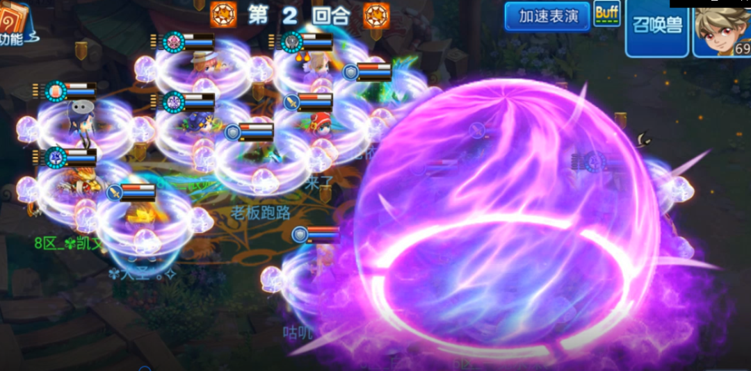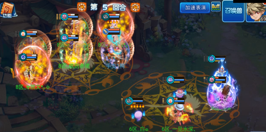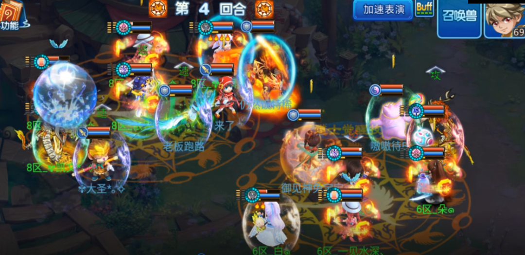 第4回合,【极白队】时客二转技能配合刀客横扫千军出手,但可惜被对方飨灵技能精灵+庇护力场+阵法技能化解;而【梦之队】则抓住对方刀客倒下的机会,刀客精灵技-火焰斩配合时客扫射+星灵成功将对方宠物都打飞并且打倒刀客和时客;
