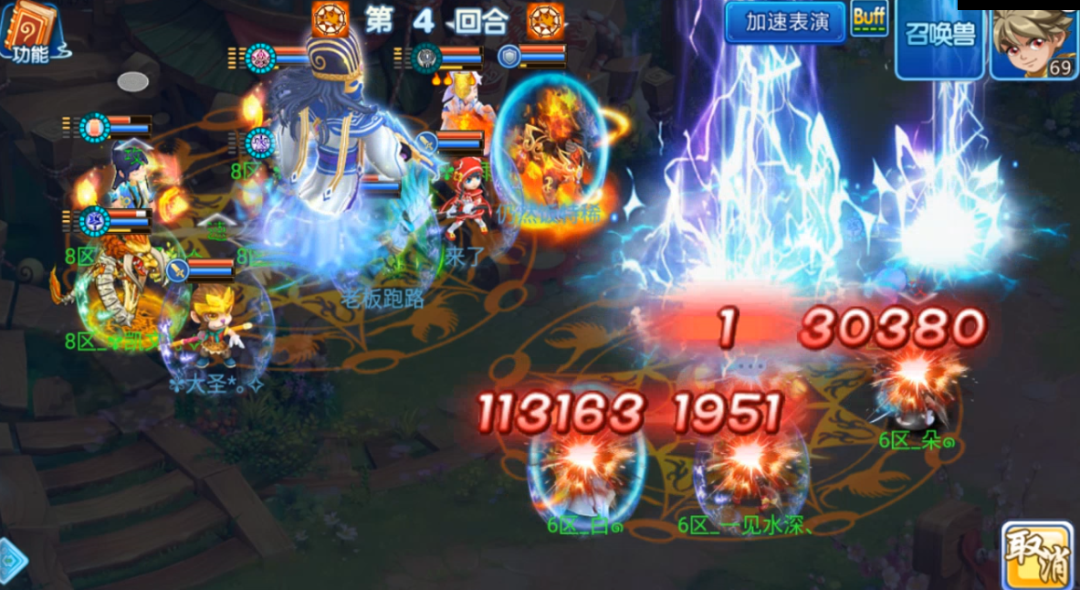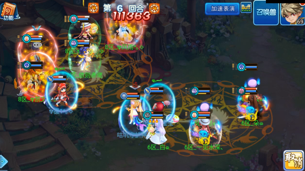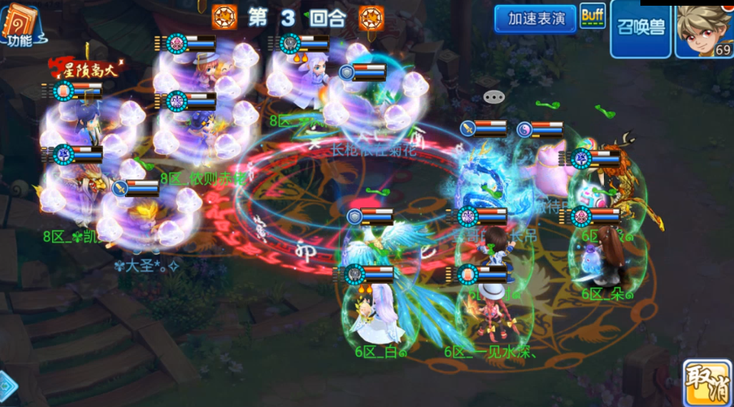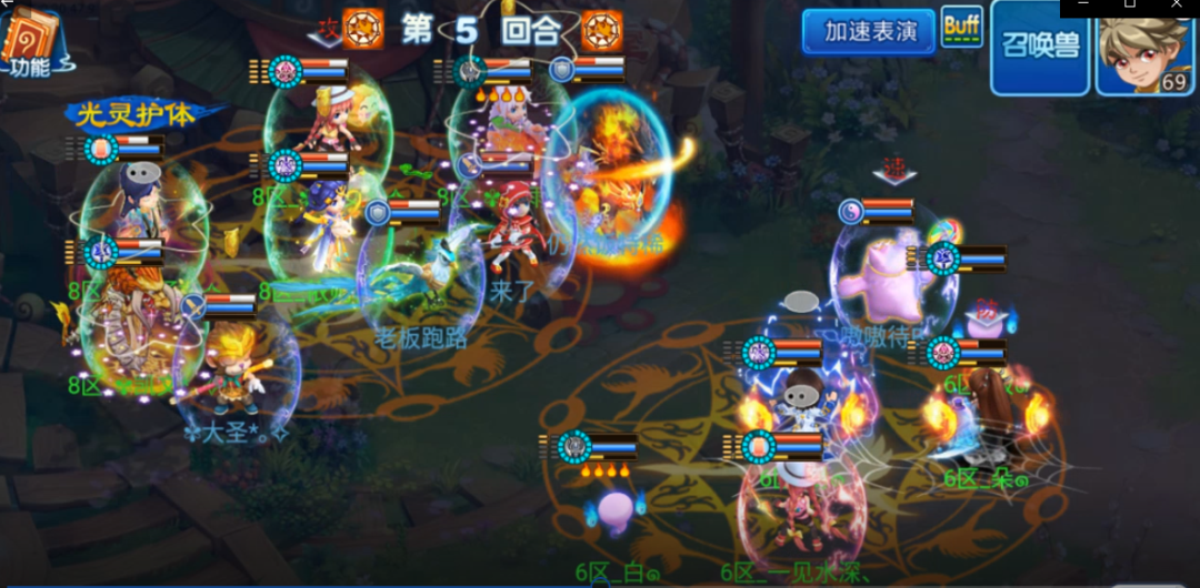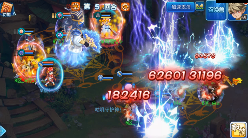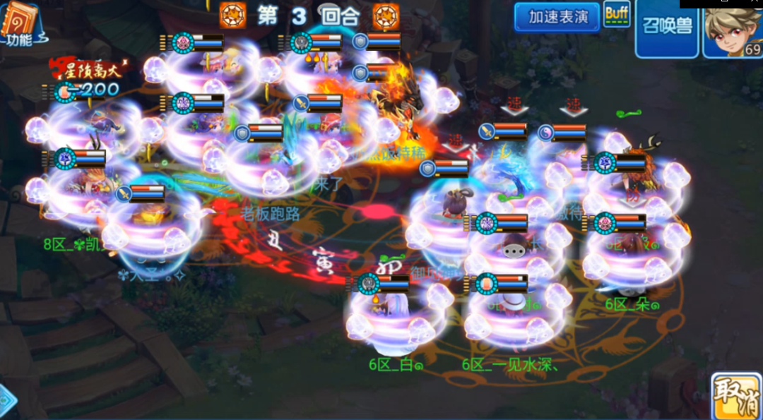 开局就爆发激烈的战斗,【极白队】时客天雷地火配合刀客群攻将对方刀客和时客天佑圣体复活打出;【梦之队】时客也天雷地火将对方飨灵天佑圣体复活打出;
