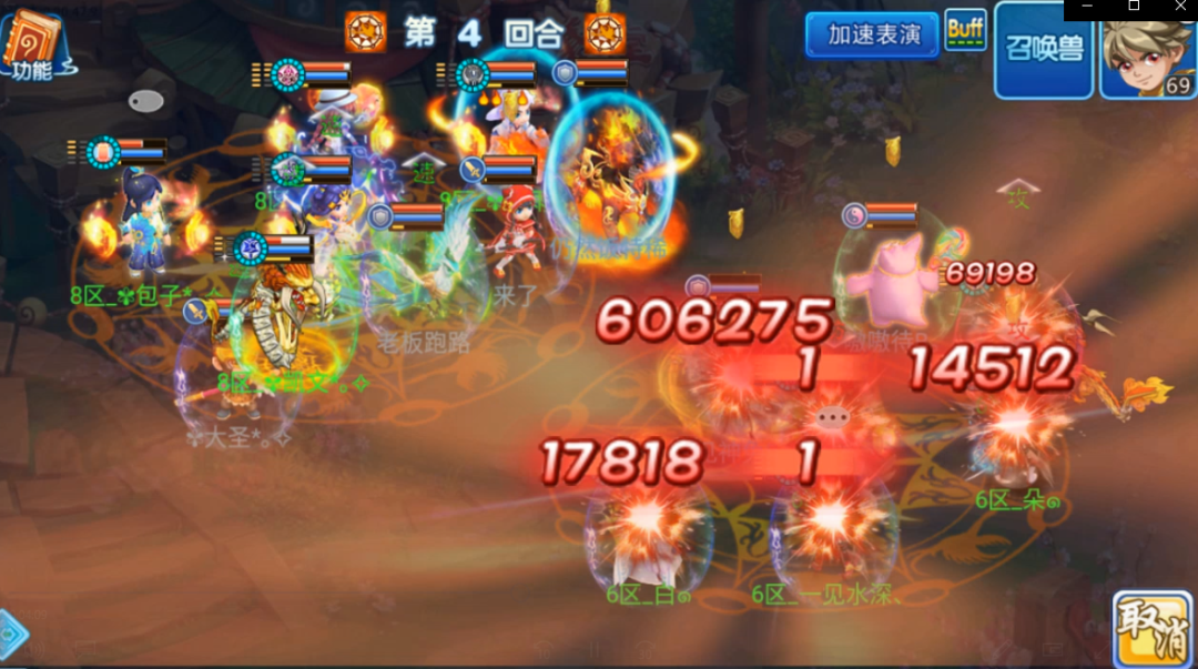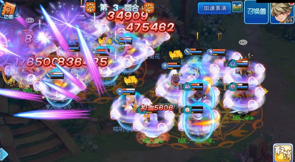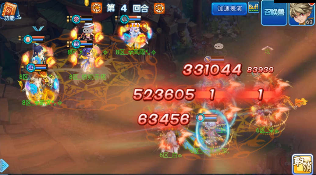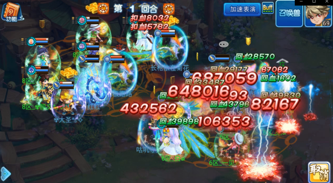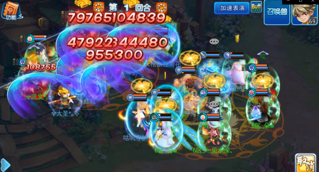 开局就爆发激烈的战斗,【极白队】时客天雷地火配合刀客群攻将对方刀客和时客天佑圣体复活打出;【梦之队】时客也天雷地火将对方飨灵天佑圣体复活打出;