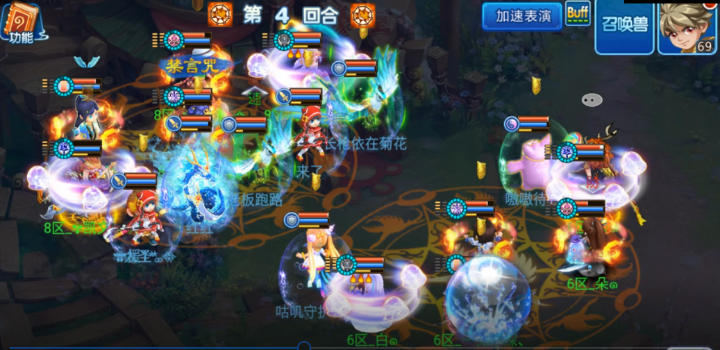 第5回合,【极白队】道士先手禁言术限制对方刀客出手,但可惜【梦之队】飨灵开启精灵技能使己方双输出解除并免疫封印,然后双输出继续出手压制对方;