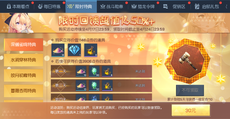 购买特典后立即获得超值奖励,购买后登录更可领取五日超多道具回馈,累计登陆5天还可分别获得一槌定音*10、头像·西岸绅士、耳环·悠乐琴音、背饰·蒲草萤绒、焕变晶核!注意哦,领取时间截止至4月24日23:59,各位同学千万不要错过!