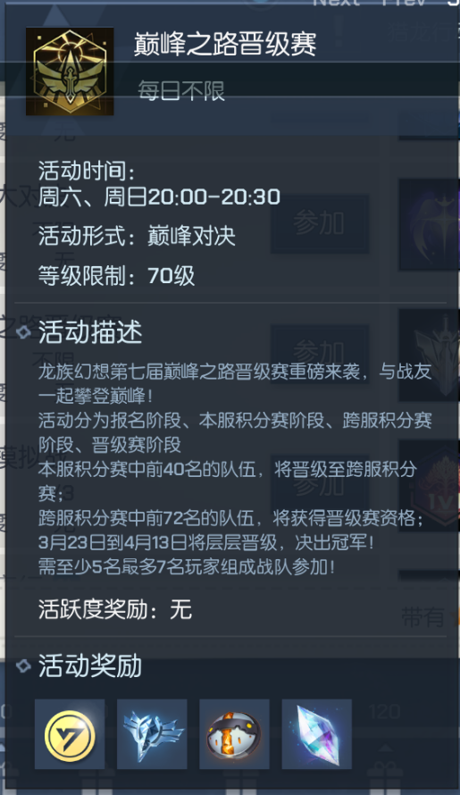 成功晋级到不同阶段可于赛程结束后(预计为4月21日12:00)可以获得不同奖励,包含限定称号、限定被动龙语、上古符咒断章、智慧初源、源光进化石、铜绿粉尘、时空之砂等,名次越高奖励越丰富!(奖励具体内容可于“活动”-“限时”-“巅峰之路晋级赛”-“奖励预览”进行查看)