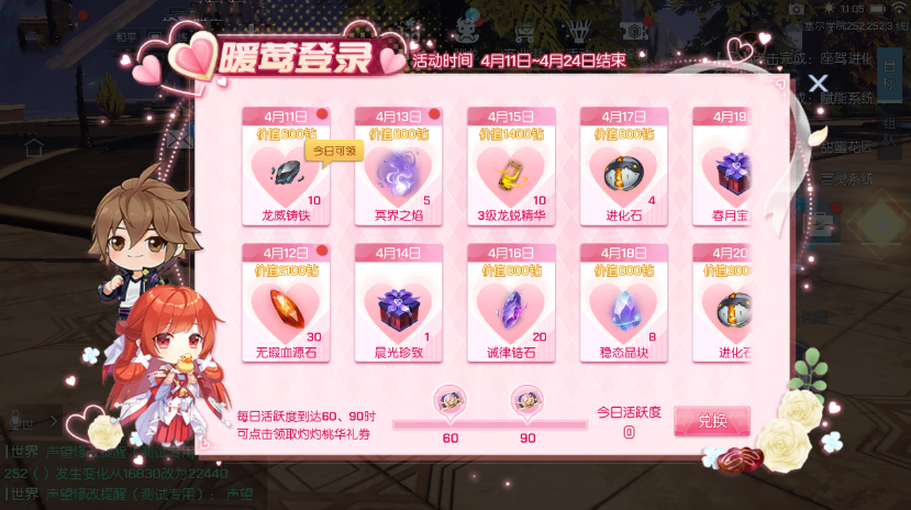 4月11日-4月24日期间,每日登录及达到指定活跃度,即可领取无瑕血源石、3级龙蜕精华、进化石、10级精神圣核、灼灼桃华礼券等好礼~