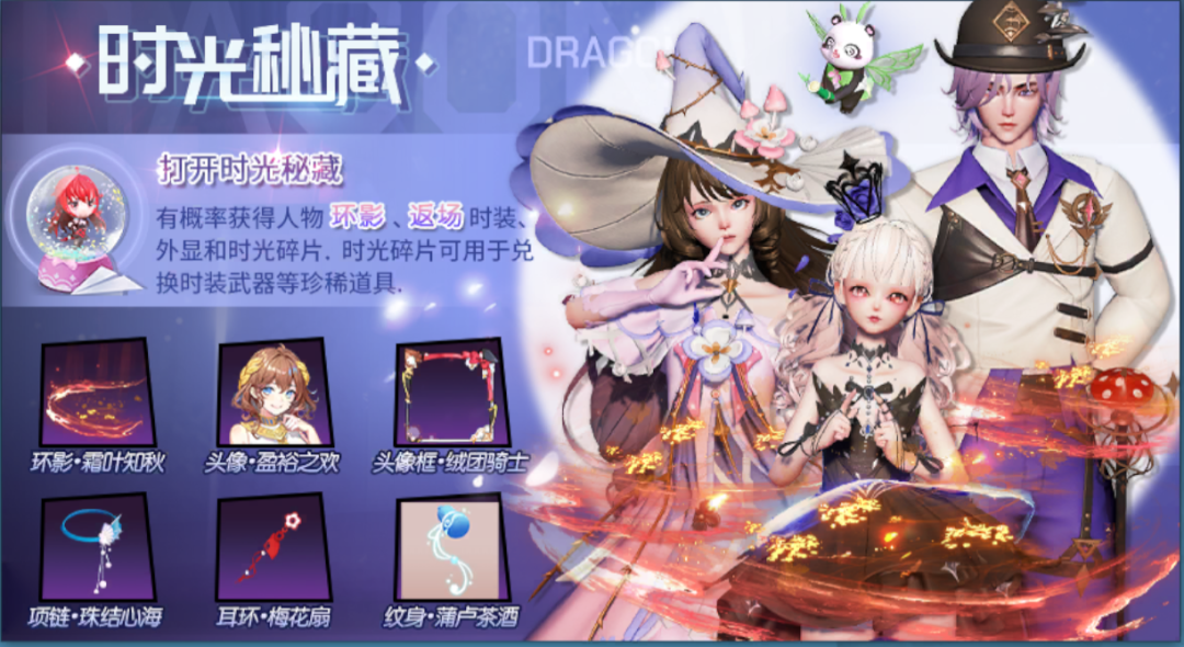 时光秘藏携人物环影、往期时装武器、时装、发型、头饰等外观限量返场啦!首周外观概率将提升30%哦!