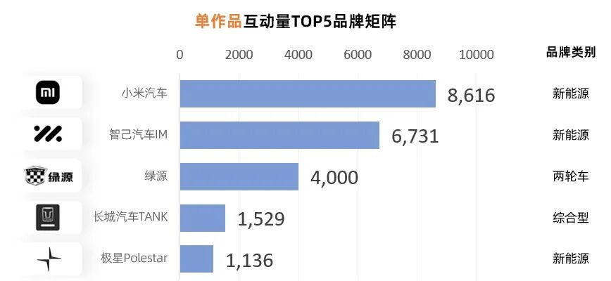 在单作品互动量TOP5的品牌矩阵中,新能源占3席、综合型和两轮车各占1席。其中,小米汽车、智己汽车IM和绿源表现尤为出色,稳居前三名。值得一提的是,小米汽车虽为起步型矩阵,但其单作品互动量高达8616,遥遥领先于其他新能源品牌,展现了强大的用户互动实力。