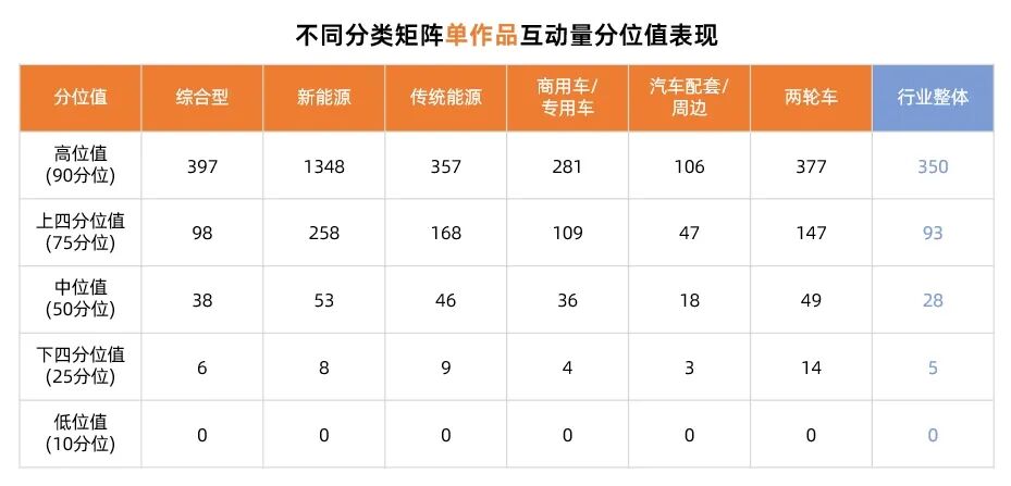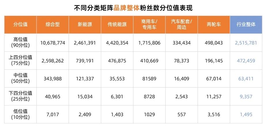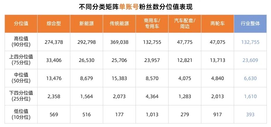 在不同分类的汽车矩阵中,传统能源、新能源和综合型矩阵的单账号粉丝数表现较为突出,高位值和平均值都相对较高,显示出较强的吸引力。同时,商用车/专用车矩阵也拥有一定数量的粉丝,且各分位值与行业整体基本持平。相比之下,汽车配套/周边和两轮车在高位值的粉丝数略低。