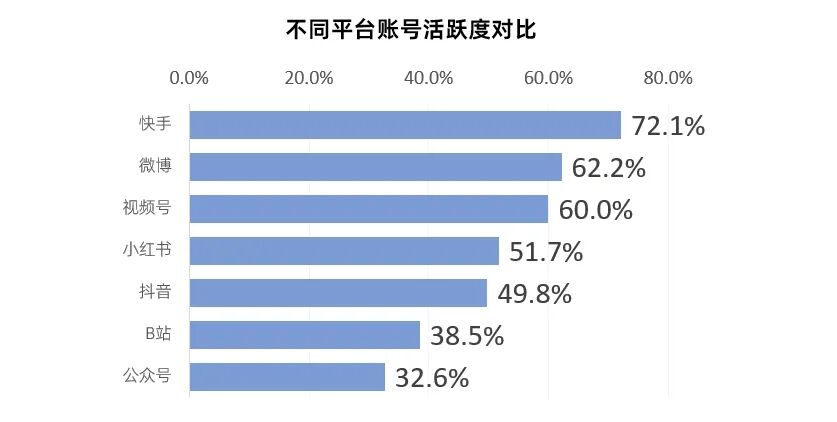 ■从各平台账号活跃度来看,快手以72.1%高居榜首,微博、视频号紧随其后;