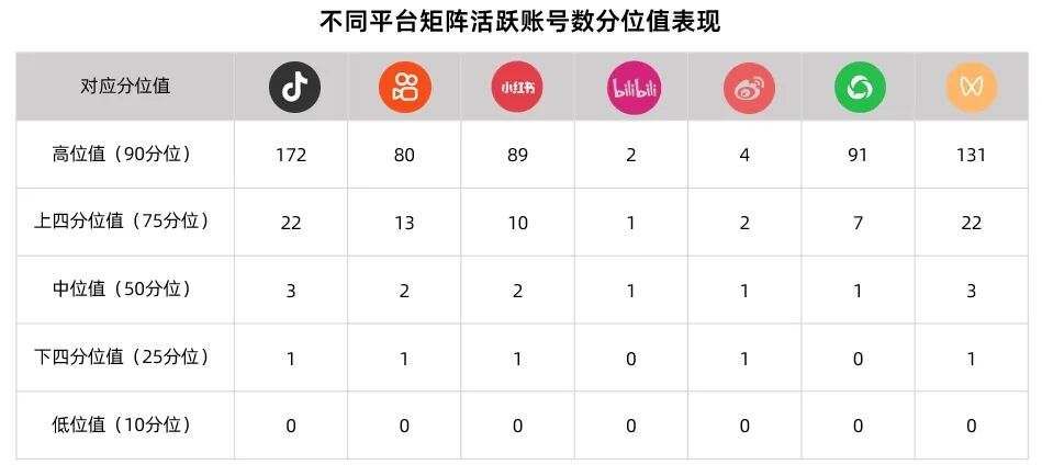 •成熟型矩阵(50<账号数≤100):粉丝稳定且内容高质量,已成为行业内的重要影响力者。