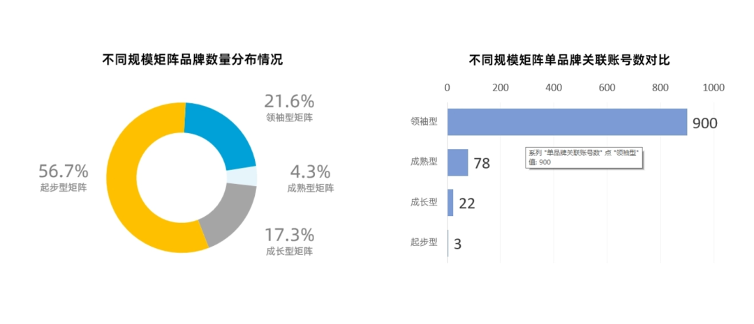 ●起步型矩阵品牌众多,占56.7%,但账号关联较少,平均每品牌仅3个;