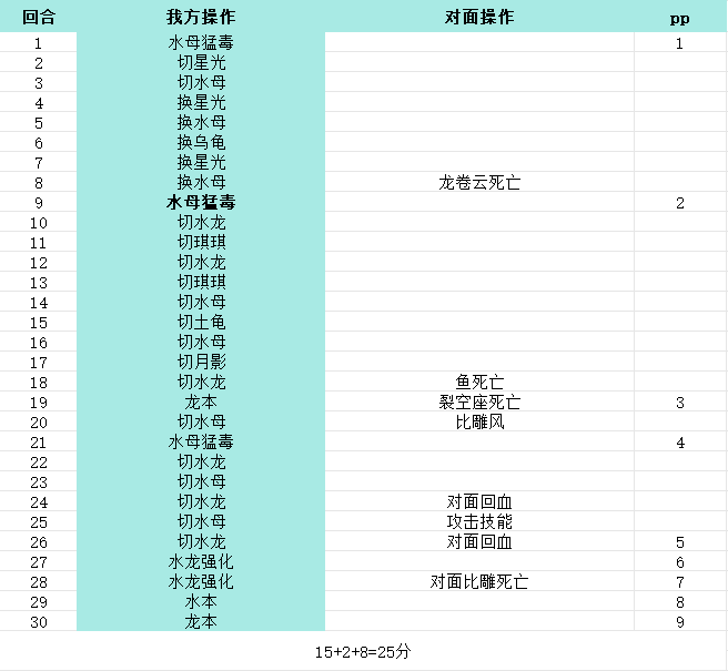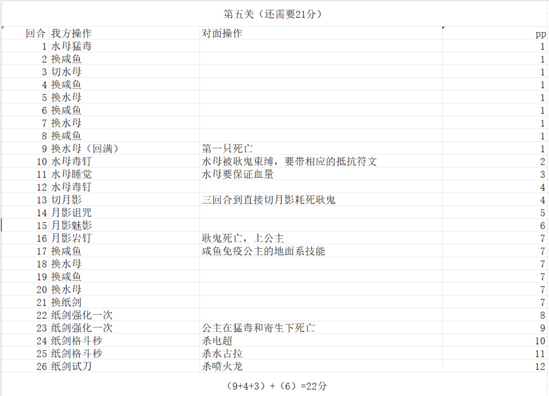 总结:要想达到125分的扫荡条件,需要每关平均下来要获得25分。想要达到这一条件则需保持宠物的高血量和pp的使用。pp的使用要控制在10及其以内,这样可以获得8分;之后则是宠物血量的保持,在血量方面我们则需要获得17分。当然,如果有的关卡是可以强化之后直接推的话,则可以在回合数上获得不少的分数,这样可以降低后续对血量和pp的要求。