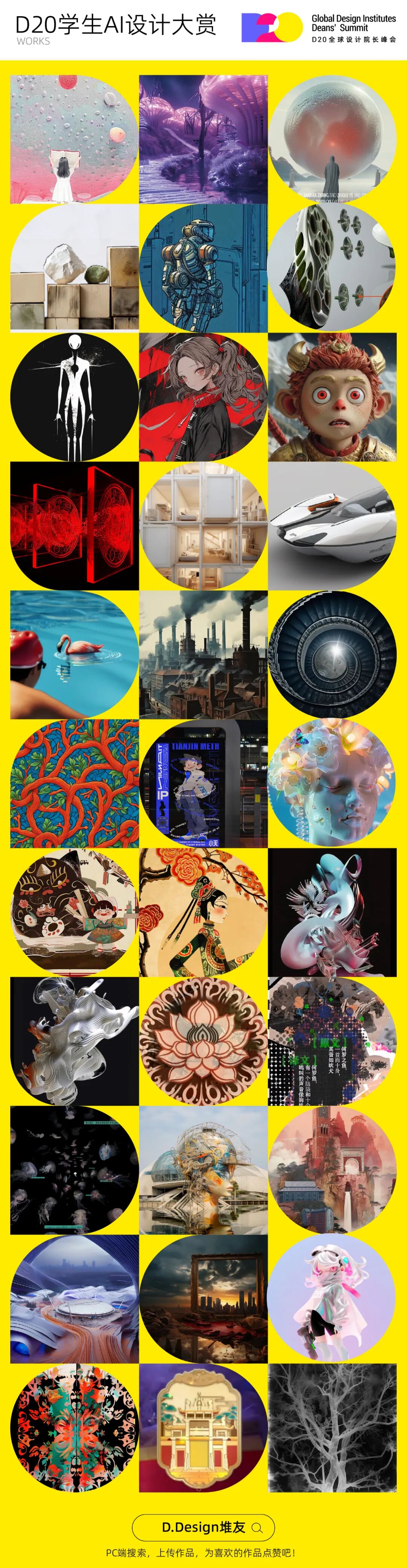 五大应用领域(电商、云计算、出海、企业数字化、影视文化娱乐)和三大热门场景(智能零售、智能出行、智能办公),承办方:淘天设计、阿里国际设计、盒马设计、企业智能设计、斑马智行设计、阿里云设计、优酷体验设计、钉钉设计。D20 2024 免费报名通道已开启!文末扫码立即报名!可在PC端搜索 D.Design堆友,进入 D20频道 查看完整议程!👇D20 2024 携手 D.Design堆友,通过连接设计「产」和「学」,致力高校合作的线上频道,为新一代AI设计师寻求更多曝光、就业和合作机会,加速其在AI领域的全面进化。【D20学生AI设计大赏】正在火热征集中,欢迎青年设计师们来SHOW出自己的大作,为喜爱的作品点赞!部分作品展示