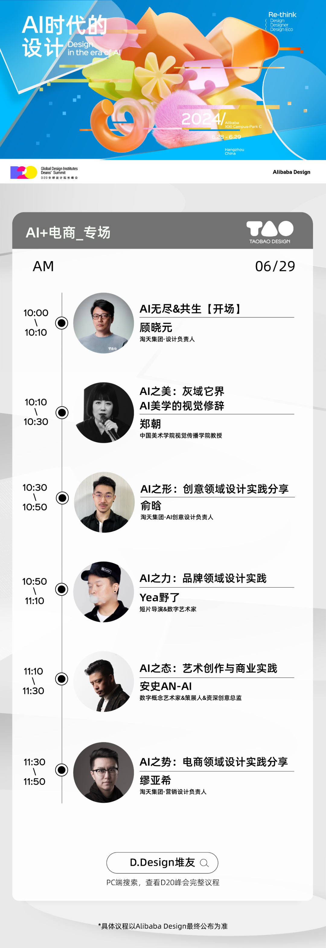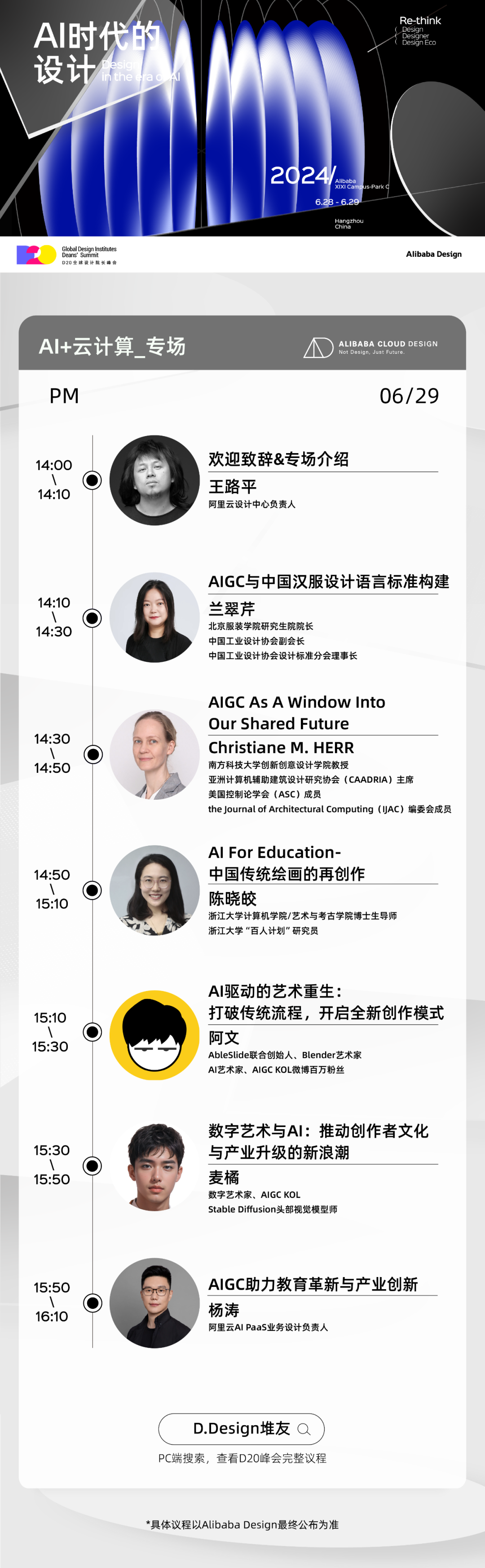 设计,在与AI的交织中焕发新生。从预见、入局到引领,生成式AI的规模化应用,打开了设计的新纪元,我们置身AI时代,设计的要素将被重置。Alibaba Design发起D20全球设计院长峰会,以「AI时代的设计」为主题,深度挖掘和连接设计的「产」与「学」,共赢AIGC。D20 2024将于6月28日—29日在杭州阿里全球总部西溪C区开启,将呈现D20峰会·主论坛、D20峰会·分论坛、AI Design Day和D20学生AI设计大赏等精彩内容。这是全球首个AI设计主题的产学峰会。工信部、高校设计院长、AI设计生态伙伴、AI产业伙伴等50+海内外大咖嘉宾将同台分享;五大领域、三大场景,一次看尽AI设计应用的大盘点;第一波20+院校的AI设计风采已在堆友,影响AI未来的青年设计师大作等你点赞...