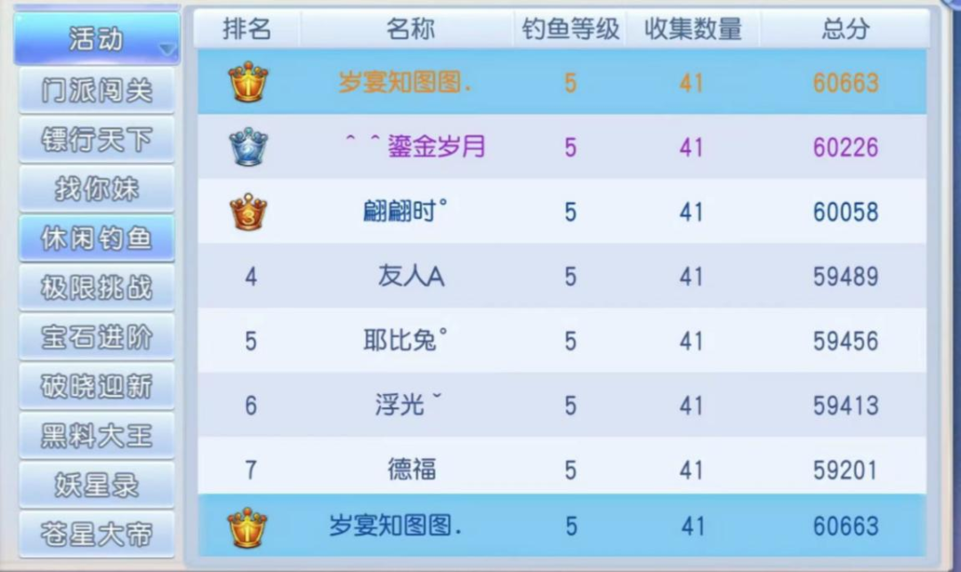 盯着拍卖看看神赋,完善自己的,看看成就跟颜值有什么缺的能补一下,钓鱼也很喜欢,目前我是我们区钓鱼积分最高的了(得意),然后就是跟cp在跨服玩捉迷藏。(为什么是跨服呢,因为她在十里我在银装)