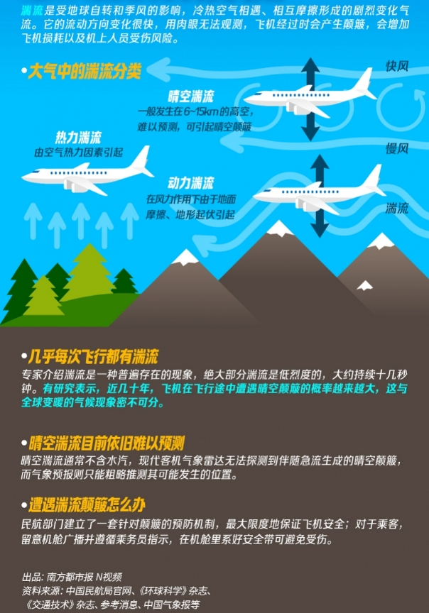 王亚男介绍,“民航客机的巡航高度,一般都是在万米左右的平流层,在这个高度进行平飞时,飞机是不大容易因乱流而产生颠簸的。不过在飞机起飞、爬升和降落过程中,飞机会在对流层中飞行,遇到乱流的可能性就比较大。”