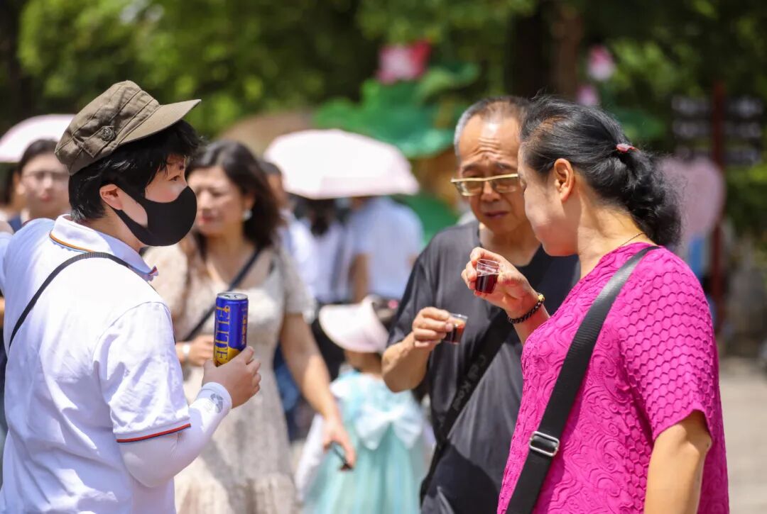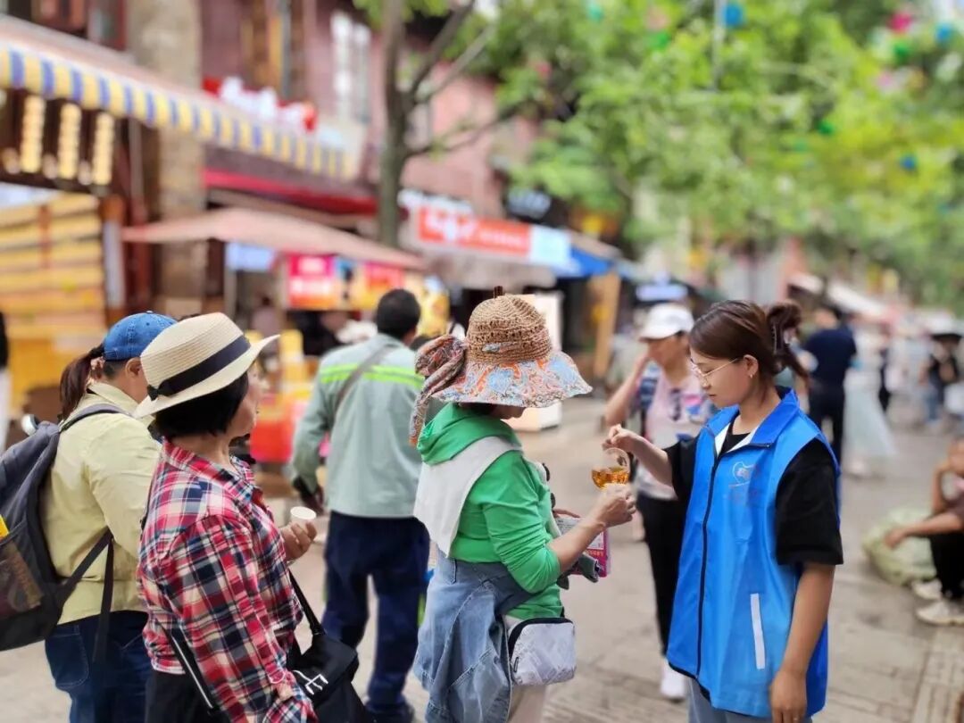 5月19日,在昆明的百余位大益茶道师顶着炎炎烈日,走进北市区、呈贡区、以及翠湖公园为来往游客、市民奉茶,并向大家普及茶道文化与普洱茶健康知识。当天,三个点共奉茶上万杯,不少市民驻足品饮大益茶,为大益公益奉茶点赞。