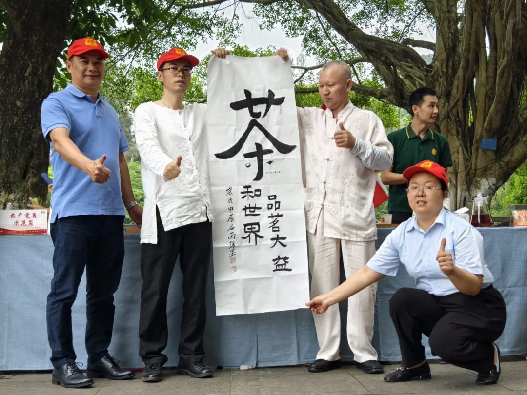 5月18日,东莞大益的益工们早早的便在公园里设置了主题茶席展示、大益八式表演、茶艺冲泡体验等活动。同时,增设了“中国古典舞”、“古筝”、“葫芦丝”等才艺表演节目。优雅、古典的才艺表演,与“大益八式”表演相得益彰,吸引了众多熙来攘往的市民驻足观赏。期间,更有市民深受活动现场气氛的感染,即席挥毫,献上“茶和世界,品茗大益”的墨宝,表达了对“国际茶日”的祝福。