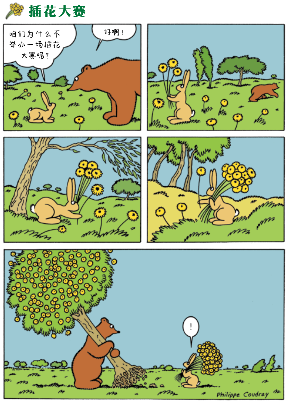 比如下面这幅漫画,兔子要和巴纳比比拼插花。以兔子的速度,很快就能收集满满一束鲜花,笨重的巴纳比怎么才能赢过以兔子呢?