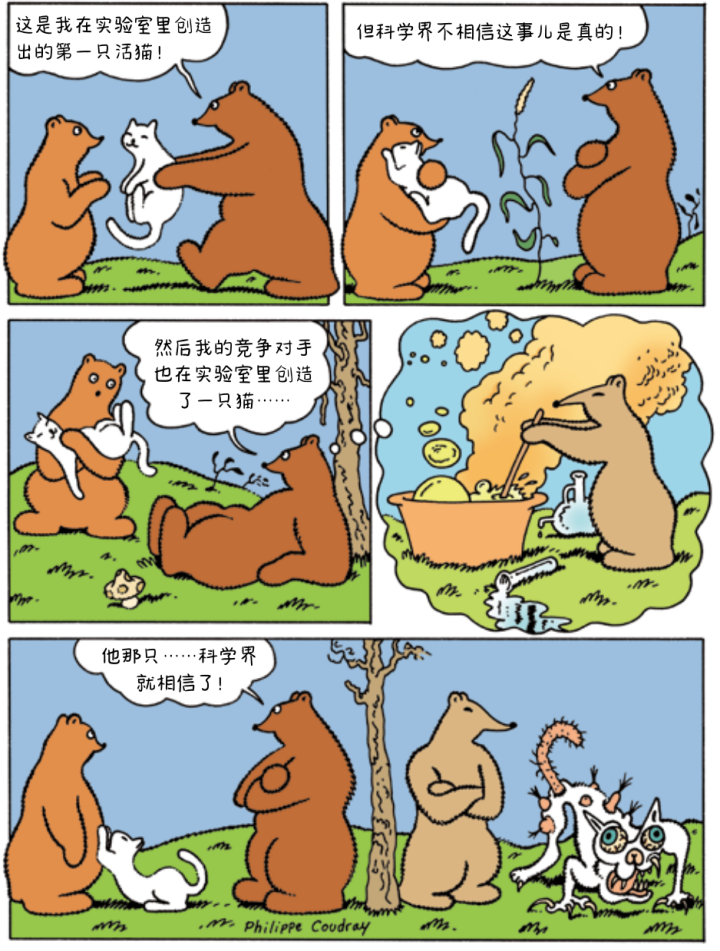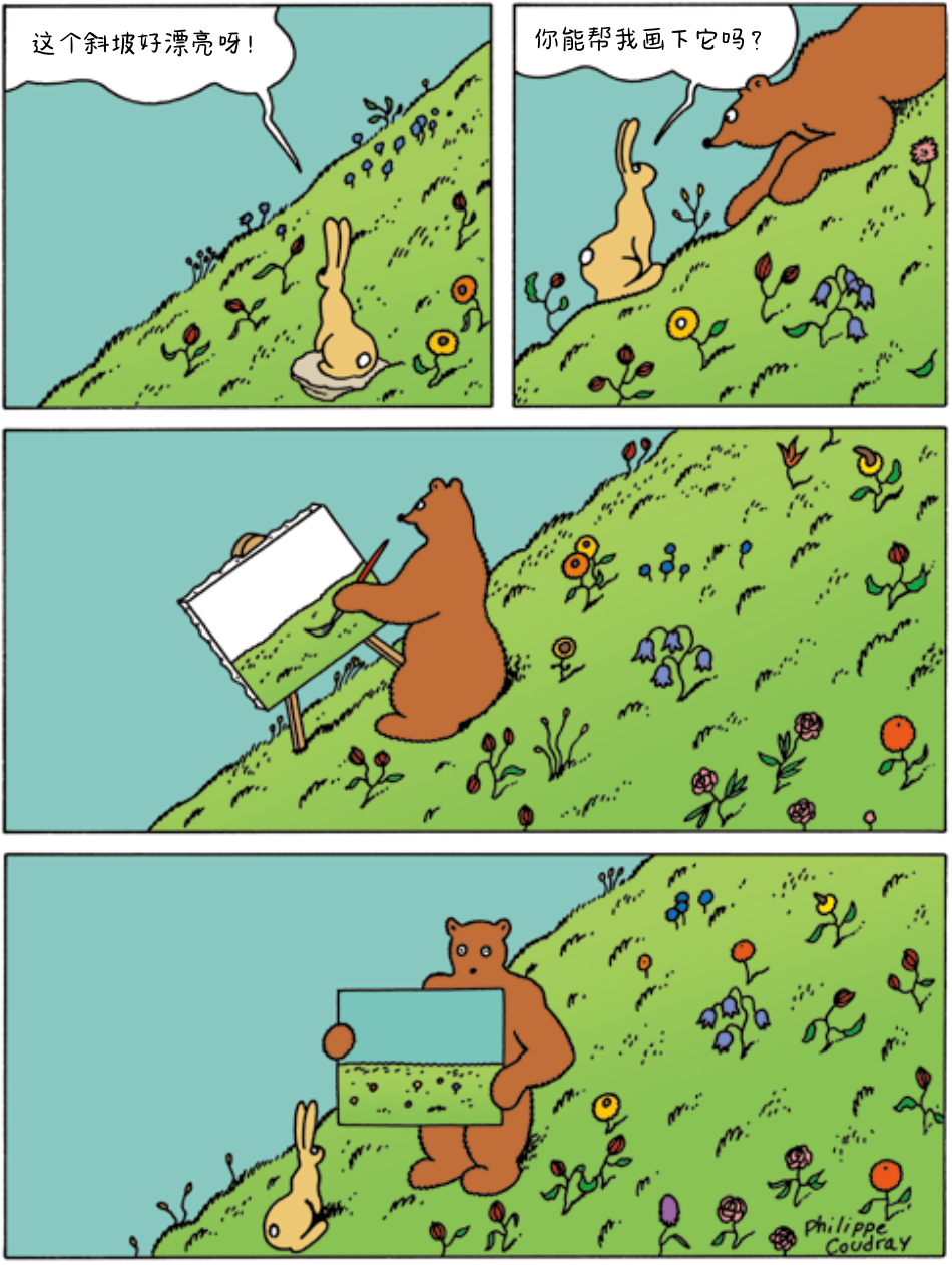 但菲利普·柯德雷却坦言,自己画漫画的初衷并非为了搞笑,也不仅仅是为儿童而创作(只是不知道为什么,儿童能比成人更快地get到笑点)。在他的笔下,这些漫画即便只有短短五六个画格,情节却还能百转千回,出人意料。