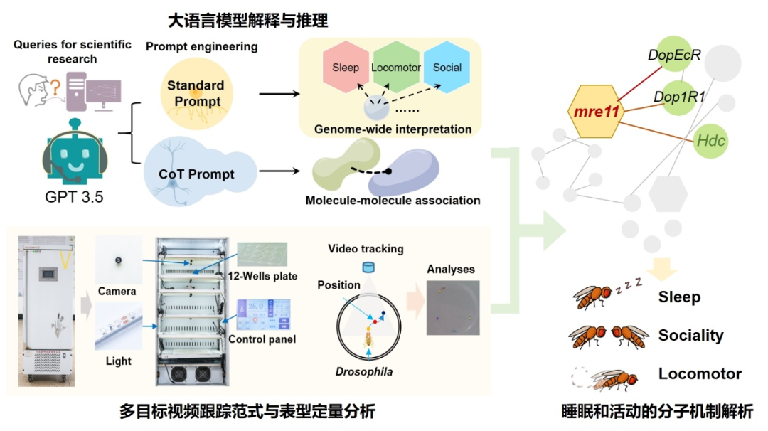 2024年5月1日,来自华中科技大学生命科学与技术学院张珞颖团队和薛宇团队在Nature Communications杂志上合作发表了题为“Large-language models facilitate discovery of the molecular signatures regulating sleep and activity”的研究论文,利用大型语言模型GPT-3.5与提示词工程技术,结合基于多目标视频追踪的果蝇表型定量装置,对果蝇基因组进行系统解释与功能筛选,预测并验证了758个果蝇基因参与调控群体/个体睡眠和活动。尤其是使用基于思维链提示方法的机器推理,发现了仅在同伴存在情况下发挥睡眠调节功能的mre11基因,揭示了MRE11可能通过调节多巴胺信号通路而影响睡眠、运动和社交活动。