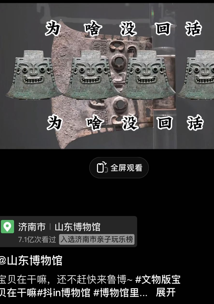 比如,山东博物馆的“亚醜钺”,在古代象征着王权,是极具威严的形象。山东省博为了吸引观众来看这个“丑东西”,在抖音上发了一首“文物版宝贝在干嘛”的神曲,一股儿土渣子味儿,让刚刚笑完河北博物馆的山东网友笑不出来了。