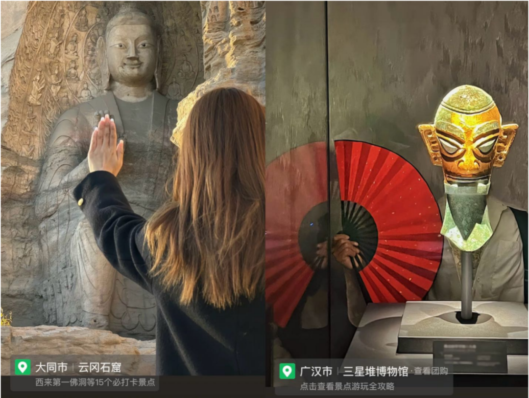 “与文物合影的正确姿势”抖音话题词下,很多网友晒出在云冈石窟“与大佛击掌”的求好运打卡照,还有重生之我在三星堆“戴面具”的借位式合影照,主打一个“什么钱也不用花,但是又什么都有了。”
