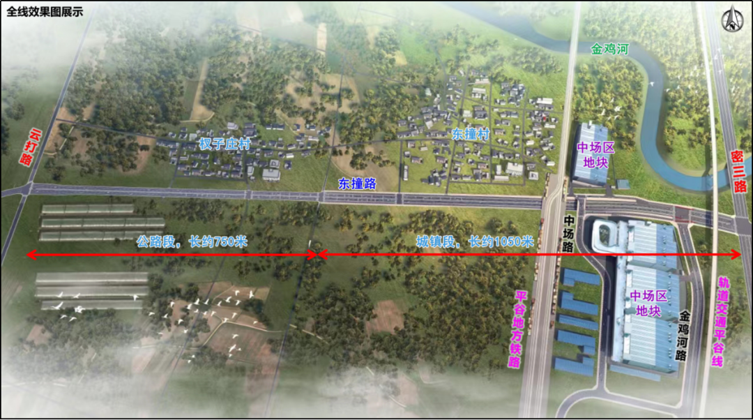 项目位于平谷区马坊镇,西起云打路,东至密三路,长约1.8公里,现状为双向两车道,按照一级公路标准改建,双向四车道,红线宽度40米。其中,杈子庄村—密三路长约1.1公里,结合马坊站中场区市政配套、沿线慢行交通功能需求,红线宽度60米。