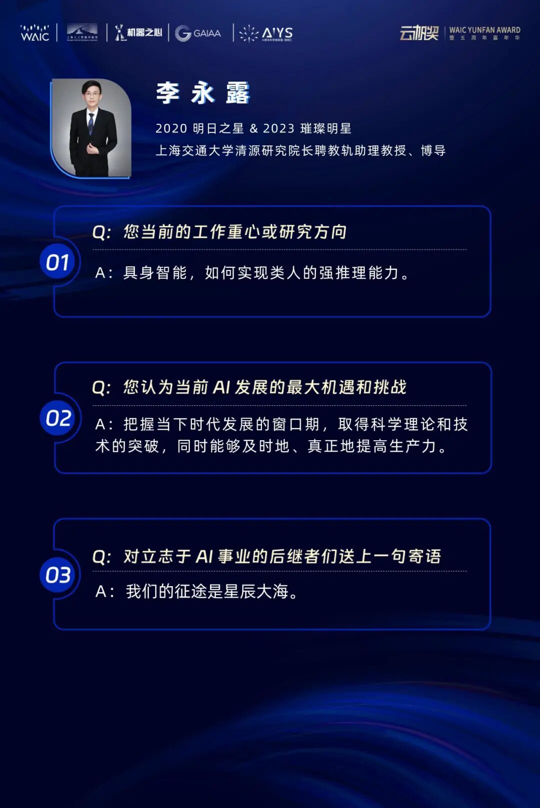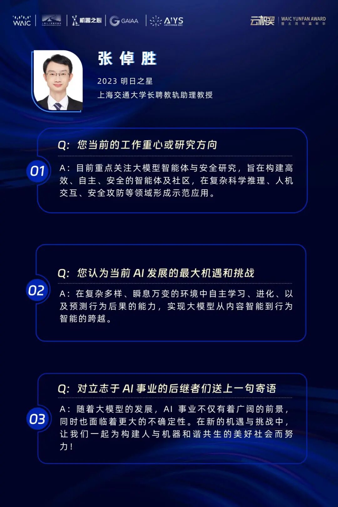 WAIC · 云帆奖于 2020 年发起设立,由机器之心、上海人工智能实验室、全球高校人工智能学术联盟和 AI 青年科学家联盟负责评选和运营,旨在表彰那些在 AI 领域乘风破浪、勇立潮头的杰出青年人才。