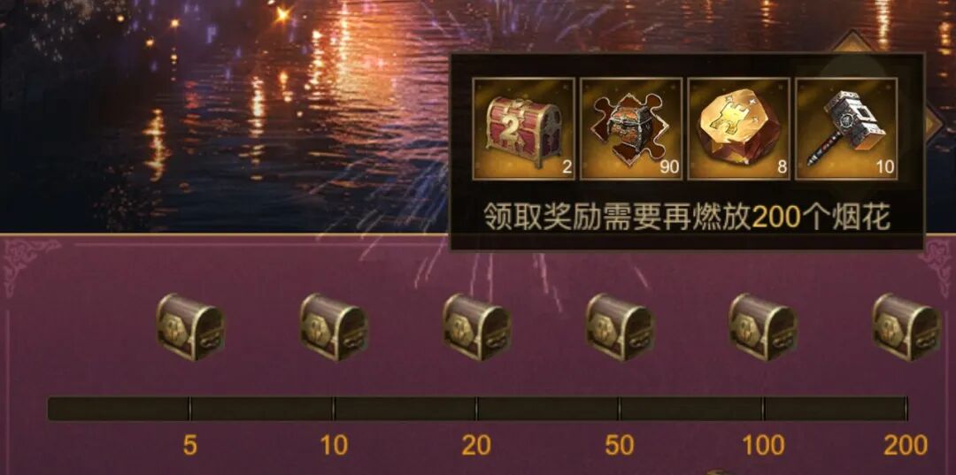 累计燃放到指定数量烟花之后还可以领取累计奖励,累计奖励包含二周年庆宝箱、橙色装备碎片和终极改造锤等奖励哦~