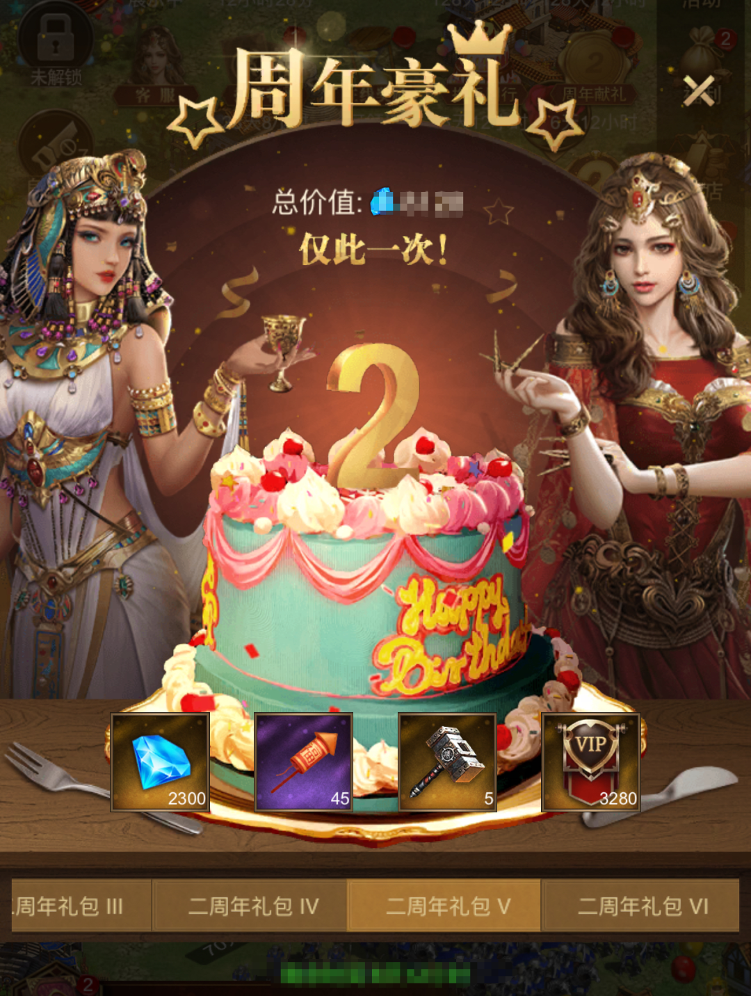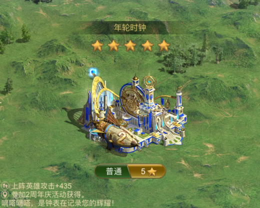 本次周年礼包为大家准备了两周年限定主城皮肤——年轮时钟,五星状态下上阵英雄攻击+435!