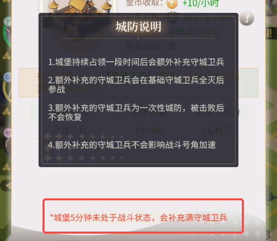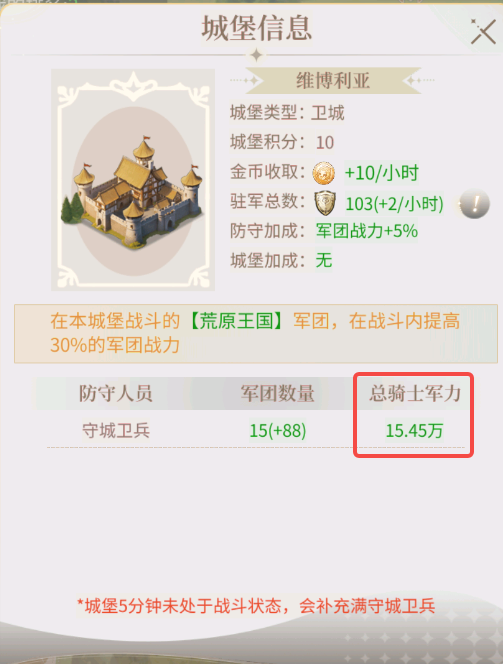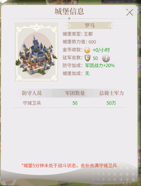 Tips:城堡守城兵力会逐渐恢复,随着占领时间的增加,守城卫兵也会随之上升,补充无上限,越快抢占越好!每个城堡的守城卫兵增加数不同,抢占越高等级的城堡效果更好;出征同时要保证道路与大本营相连。