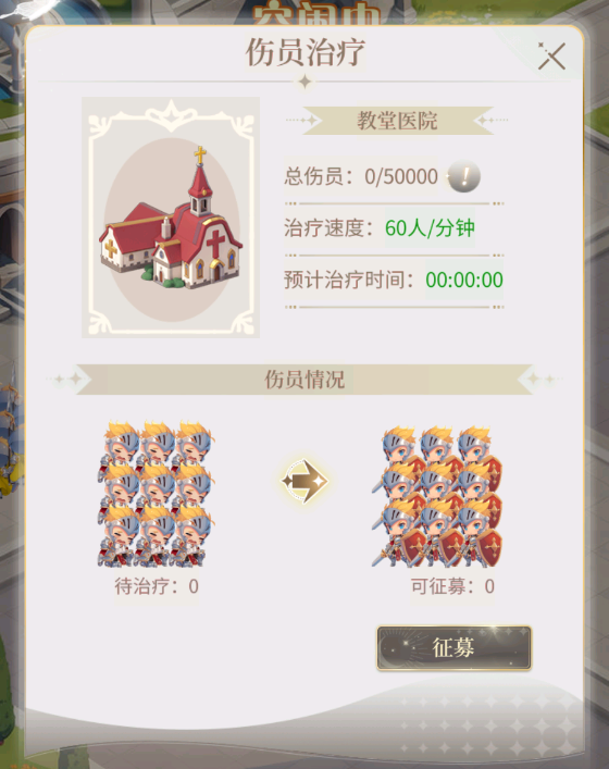 3、教堂医院。征战中伤亡的50%会转化为伤员,获得治疗后可征募为骑士。(不可超过医院上限)