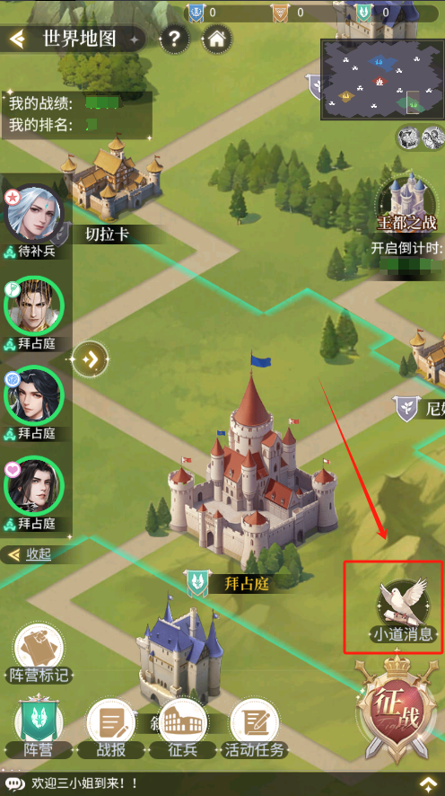 优先行军前往【小道消息】所在的城堡,获得增益buff,有利于后续对外扩张获得势力值!