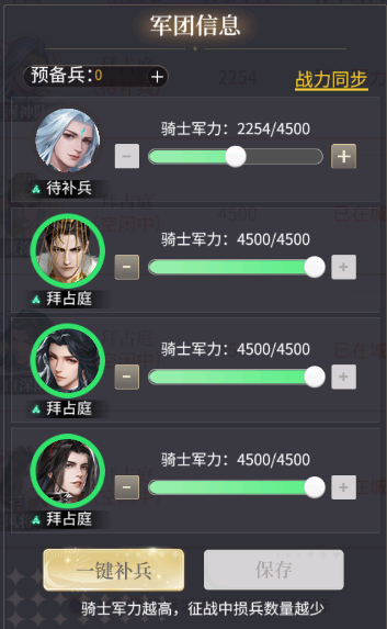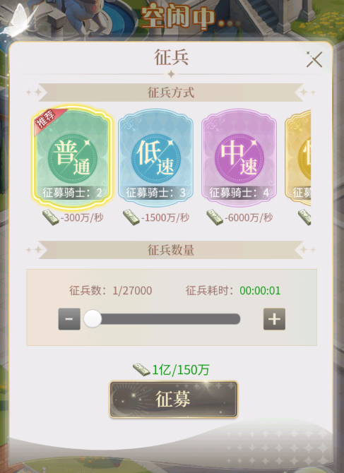 1、资金征兵。不同征兵方式需要的时间和资金不同,但骑士的质量无差别,取消后可返还未消耗资金。