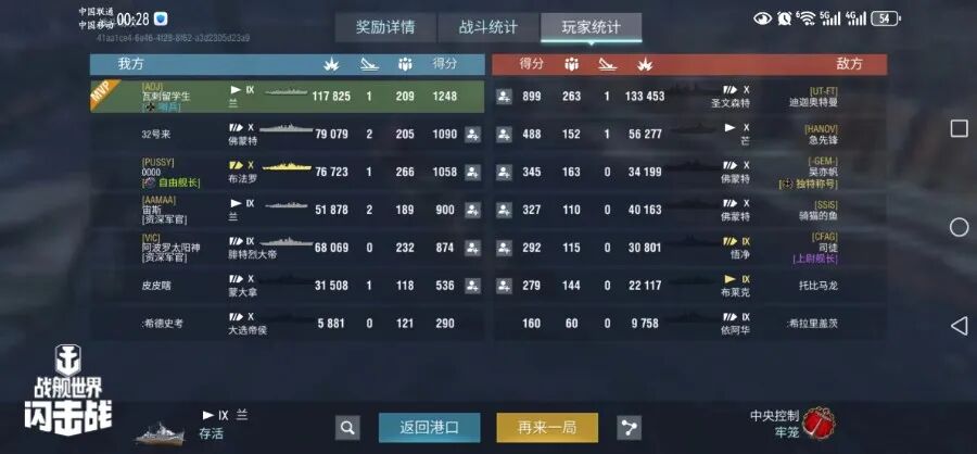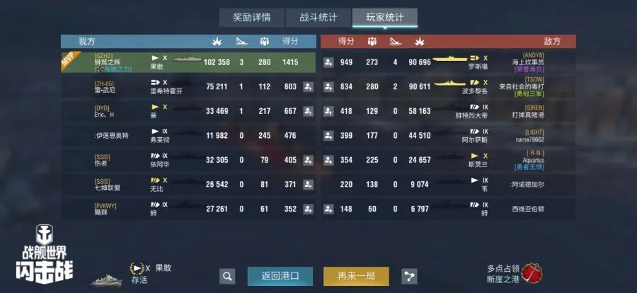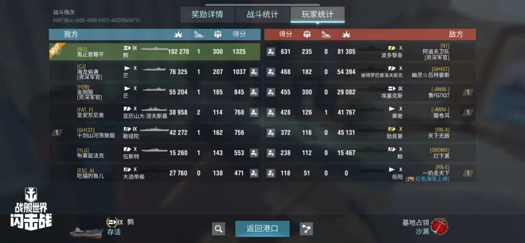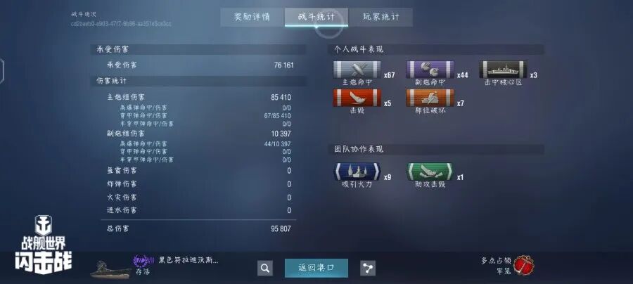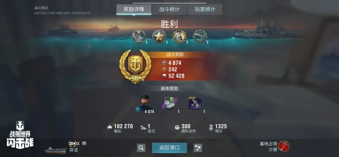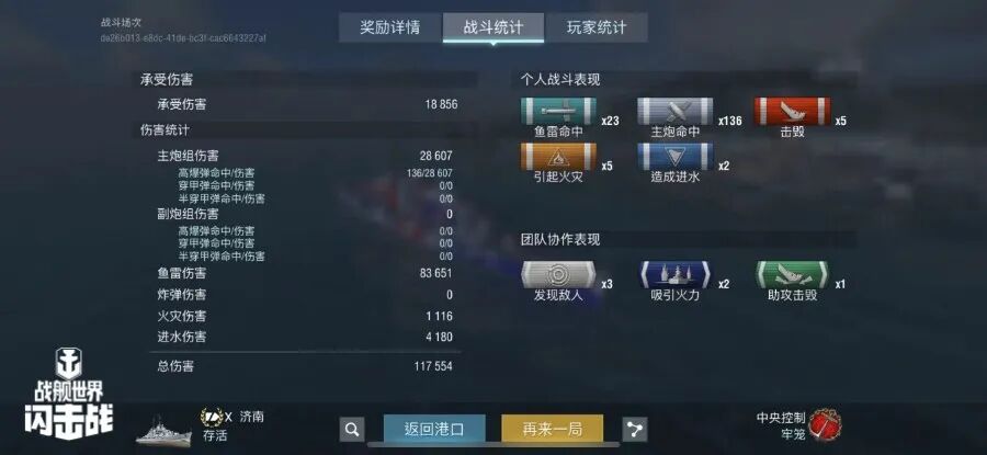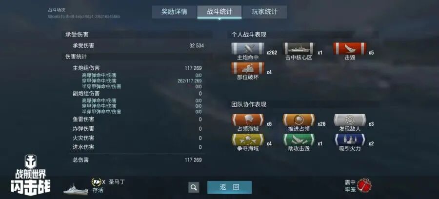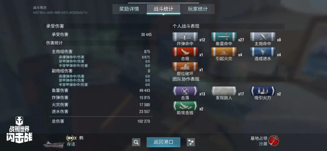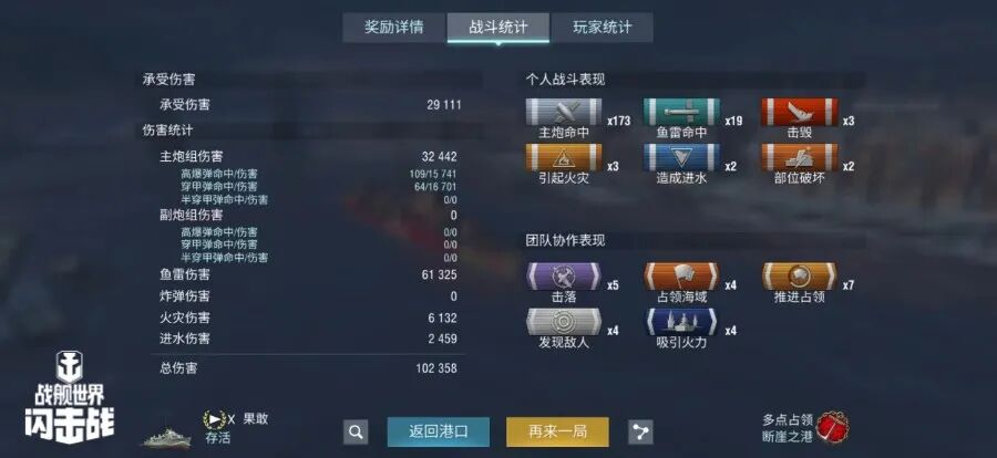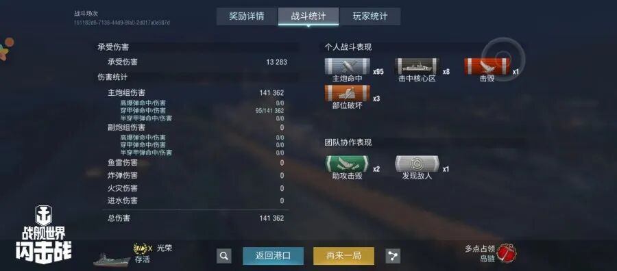 舰长@狮鹫之辉驾驶Y系X级驱逐舰果敢鱼雷命中19发!主炮命中173发!击毁敌方战舰3艘,造成敌舰起火3次!总伤害达10w+!恭喜舰长获得本场最后希望史诗勋章~