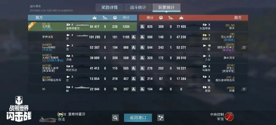舰长@北京舰驾驶D系X级航母里希特霍芬炸弹命中30发!鱼雷命中18发!击毁敌方战舰5艘!总伤害6w+!恭喜舰长获得海怪来袭,众生平等两种史诗勋章~