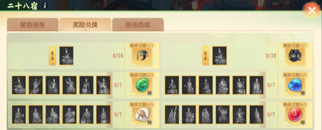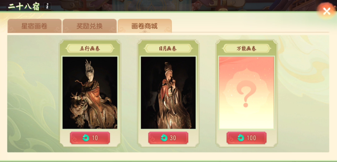 如果有缺少的星宿画卷,小可爱们也到画卷商城购买画卷补齐,若购买五行画卷、日月画卷,将概率获得五行/日月星宿画卷,若购买万能画卷后,可在全部星宿画卷中指定一张获得。