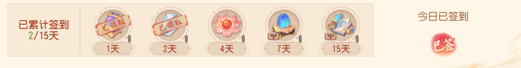 当累计登录达1天、2天、4天、7天、15天可获得霓石图谱、五宝、还灵丹等额外奖励。每个累计签到节点还可以获取1张【万能画卷】!