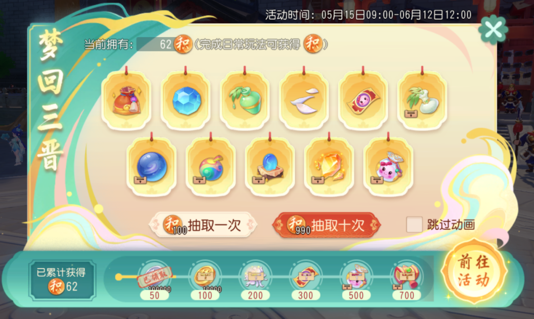 每获得100古韵积分,大家即可前往奖池参与1次抽奖,也有机会获得神兜兜、五宝、镜中花碎片等珍稀奖励!