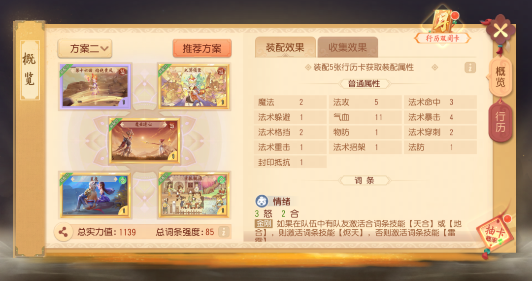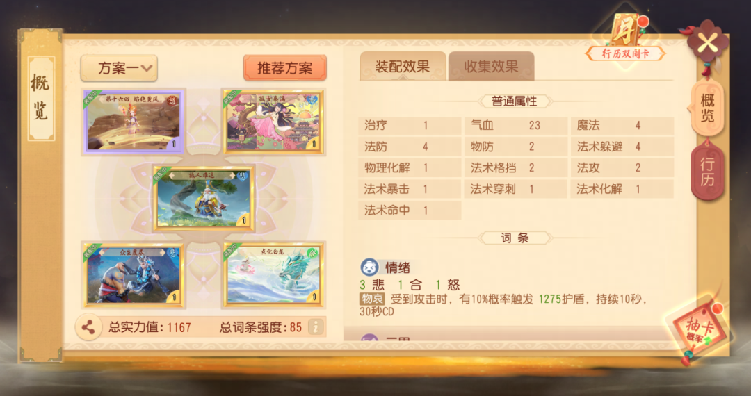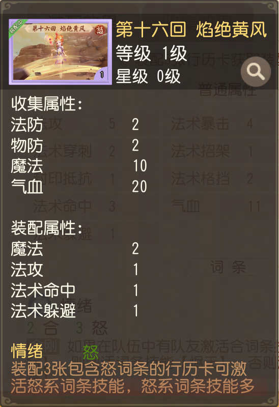同时,【第十六回 焰绝黄风】带有情绪词条【怒】,装配3张包含怒词条的行历卡可激活怒系词条技能,怒系词条技能多为加强攻击。