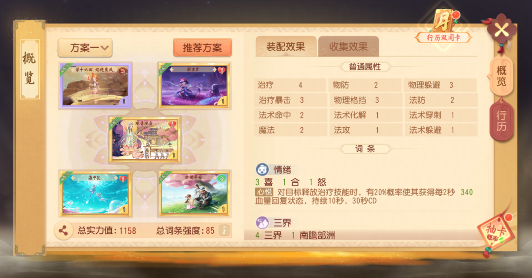 3【喜】+1【合】+1【怒】的情绪词条搭配构成【心悦】,对目标释放治疗技能时,有20%概率使其获得血量回复状态。