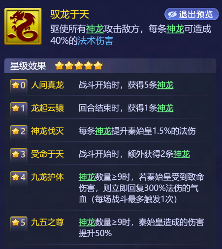 升至4-5星:神龙数量大于等于9,若秦始皇受到致命伤害,立即回复300%法伤气血(每场战斗最多1次),且秦始皇造成的伤害提升50%