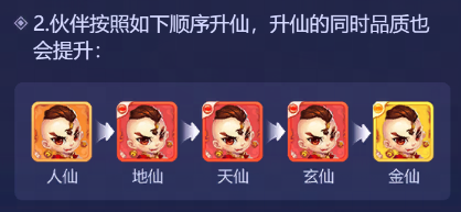 3、伙伴按照如下顺序升仙,升仙的同时品质也会提升: