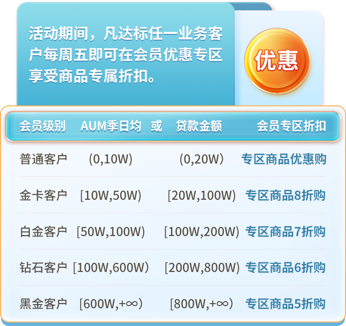 3.客户在当月可享受的折扣标准,按客户上月末在我行的AUM季日均或贷款金额对应档位计算;如客户AUM季日均和贷款金额对应不同档位,则按可享受的最高优惠档位计算;因数据统计及更新等原因,每月10号以后按上月最新达标对应档位计算。