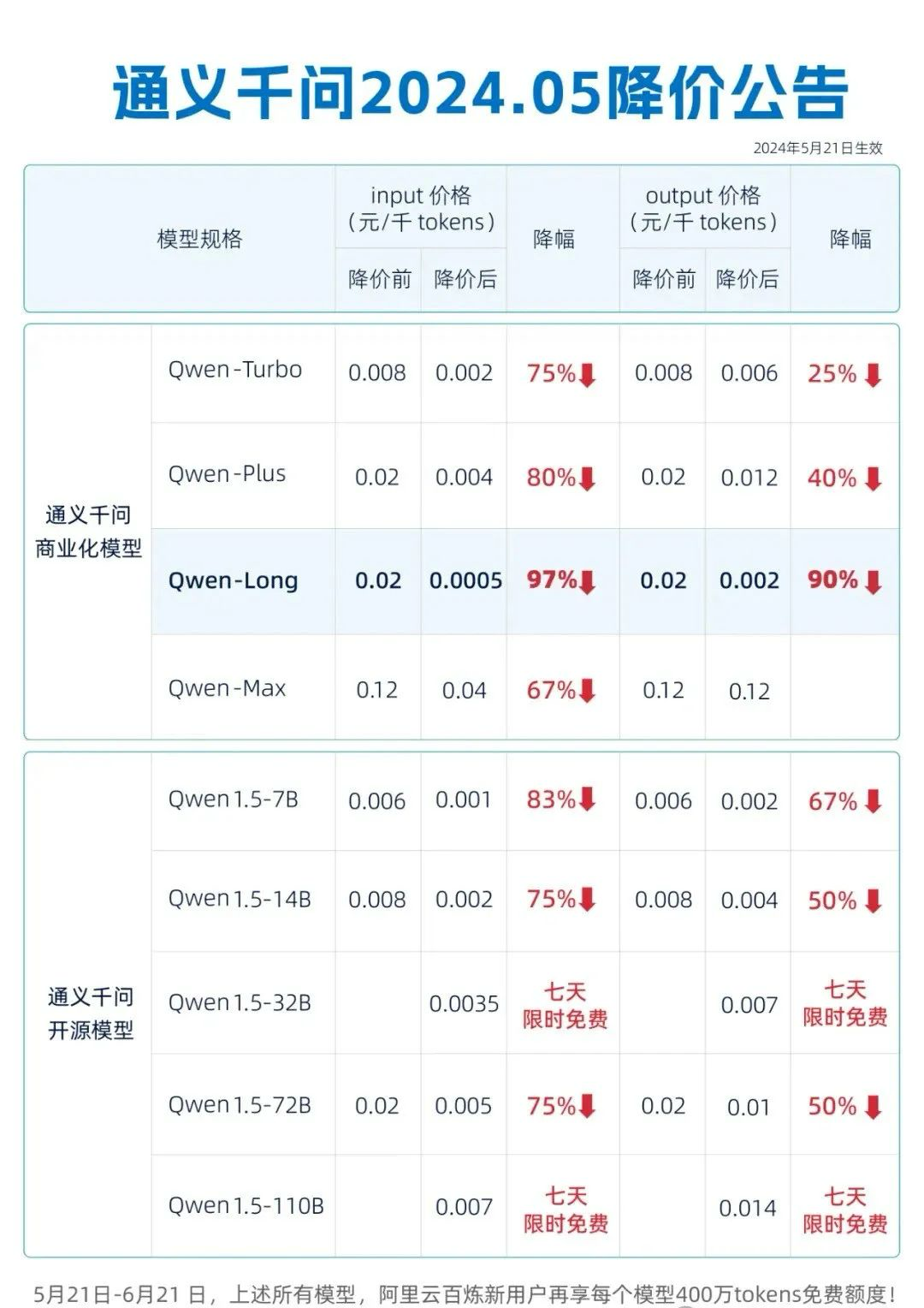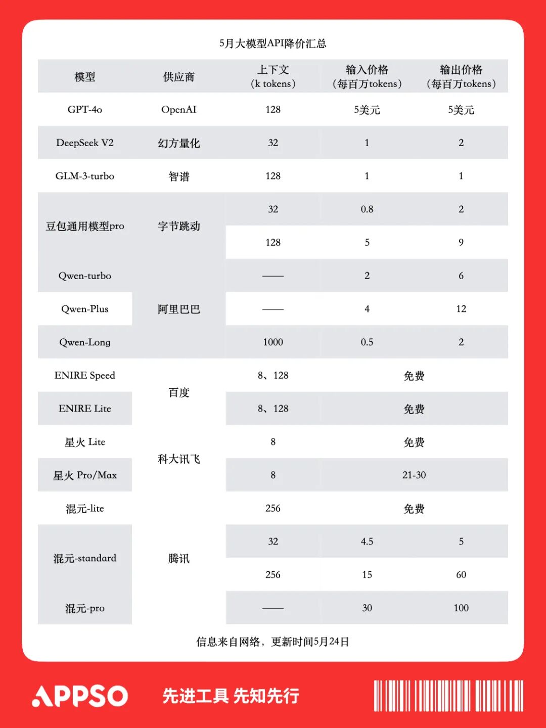 万万没想到,今年「618」竟然从 AI 大模型开始。短短几天内,腾讯、阿里、百度、科大讯飞等国产大模型纷纷降价,让我们提前感受到了朴实的「购物节」氛围。不过在好戏开场之前,我们先弄清这些厂商所说的大模型价格到底指的是什么。通常情况下,一家 AI 大模型公司在训练出自己的闭源大模型后,会将其 API(Application programming interface,应用程序编程接口)出售给开发者并收取费用。PI 就像是饭店中的服务生,图来自 hububble.com开发者在大模型 API 的基础上,通过投喂数据、微调等方式进行优化,这就是很多大模型厂商的变现模式。不难看出,大模型价格的变动或许不会直接影响到消费者,但会直接影响到开发者制作应用的成本。虽然目前也有一些 AI 大模型公司采用会员制、计时制等模式,但普遍还是按使用量计费,类似于手机流量套餐,只不过计费单位从流量的 GB 变成了 token。但 token 与汉字、字母的对应关系目前还没有统一标准,各家也有自己的定义。根据此前消息,腾讯 1 token≈1.8 个汉字,通义千问 1 token=1 个汉字,也有的是 1 token≈0.5 个汉字。因此,各家计费标准有所不同,但大致遵循大模型规模越大、定价越贵的规则,毕竟有训练成本在这里。目前阶段,卖 API 调用量这一商业模式各大厂商仍在探索,很多厂商尝试通过各种方式提高大模型的 API 调用量,但增长却并不明显。在这种情况下,大模型 API 降价可能会吸引一些开发者从「免费试用」开始尝试 AI 应用,对抢占市场、激活市场有一定的积极意义,这是这场「大战」的前提和背景。5 月 6 日,幻方量化率先打响这波降价「大战」第一枪,旗下大模型 DeepSeek-V2的价格降到了每百万输入 tokens 仅需 1元的价格,还打出了「登录就送 500W tokens」的口号。5 月 11 日智谱大模型也「跟上节奏」,推出新的优惠措施,新注册用户可以获得额度从 500 万 tokens 提升至2500万 tokens。入门级产品 GLM-3-turbo 价格从5元每百万 tokens 将至 1 元,降幅达到了80%。在公布价格的时候还「贴心」地把自己 GLM-3-turbo 与阿里、百度、ChatGPT做了对比,火药味十足。5 月 15日,字节豆包宣布:「把大模型的价格打下来了!」火山引擎总裁谭待宣布豆包主力模型在企业市场的定价为 0.0008 / 千 tokens,对比百度阿里及市面上同等规格模型的定价一般为 0.12 / 千 tokens,做到了「从分到厘」的价格内卷。他还举了一个例子:「一元钱就能买到豆包主力模型的 125 万 tokens」,大约 200 万个汉字,相当于生成三本《三国演义》。5 月 21日,面对字节跳动的价格战,阿里云相关负责人颇有反击意味地表示:「友商大模型公司提出各种降价主题,降价目的是普惠市场,在中国什么样的公司真正有能力、有资本降价,要看模型基模能力是否领先、有没有推理资源、当下模型是不是已有很多用户在使用、大模型是不是最核心业务。」与此同时,阿里云还打出了「击穿全球低价」的口号,旗下 9 款大模型集体降价,「GPT-4 级」助理模型 Qwen-Long 价格降到每百万 tokens 输入 0.5 元,输出 2 元。也就是 1 块钱可以买到 200 万 tokens,相当于 5 本《新华字典》的文字量,但价格却仅为 GPT-4 的约 1/400。仅仅几个小时后,另一个总是被对标的百度也展开行动,文心大模型两款主力大模型 ERNIE Speed 和 ERNIE Lite 直接全面免费。这两款虽然不是其大模型中的旗舰款,却是目前百度文心大模型系列中服务用户最多的模型。5 月 22 日,科大讯飞也宣布加入「降价火拼」,讯飞星火 Lite API 永久免费开放,讯飞星火 Pro/Max 低至 0.21 元 / 万 tokens,并表示「使用讯飞星火 3.5 max 仅需 2.1 元即可生成一部余华《活着》的内容量」。同一天,腾讯云宣布加入大模型降价阵营,其混元-lite模型 API 价格从 0.008 元/千 tokens 全面免费,新上线的混元-standard、最高配置的万亿参数模型混元-pro API 均出现价格下调,并立即生效。至此,几乎所有大模型大厂均已入局,似乎一夜之间,大模型就集体开启了疯狂的降价内卷。不仅是国产厂商,以 OpenAI 为代表的国外大模型也在不断下调大模型价格,虽然不像国产厂商这样集中,但行动的时间却比国产厂商更早。2023 年 3 月推出的 GPT-3.5 turbo 将每千 tokens 的成本降到 0.002美元,相比之前的 GPT-3.5 turbo 降低了90%。11 月发布的 GPT-4 Turbo 输入 tokens 价格仅为 GPT-4 的 1/3,输出 tokens 价格是 GPT-4 的 1/2。近期发布的 GPT-4o 相比此前的 GPT-4 turbo,速度快了 2 倍,但价格却便宜了一半,从 2023 年至今已经连续四次降价。不难看出,对于 OpenAI 而言,降价已经成为其不断升级与扩展市场的核心策略。其他大模型诸如 Gemini 等也都不忘在性能之后加上价格的变化,大降价已经成为大势所趋。事实上,无论国产大模型还是国外大模型,降价的根本原因还是在于推理成本的快速降低。不久前 DeepSeek-V2 就在一篇论文中为我们介绍了其利用 MLA(Multi-head Latent Attention,多头潜在注意力)结合 MoE(Mixture-of-Experts 专家混合模型),实现模型性能跨级别提升,同时减少计算量、推理现存及成本的案例。https://github.com/deepseek-ai/DeepSeek-V2/blob/main/deepseek-v2-tech-report.pdf随着算力的提升和算法的不断进步,这一趋势还将继续。创新工场董事长兼 CEO 李开复在近期的一次访谈中谈到近期出现的降价狂潮,也认为「整个行业每年降低 10 倍推理成本是可以期待的,而且必然也应该发生」。不过,他也表示,目前出现的是一种不可持续的「ofo 式」双输打法,表示