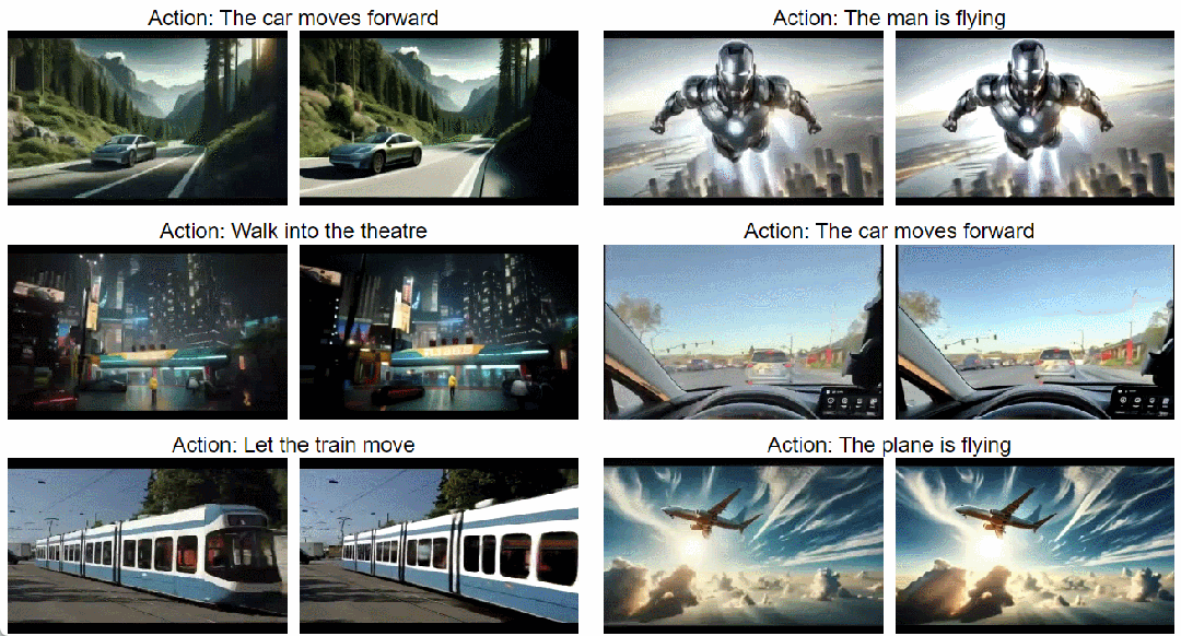 动作可控性跨域迁移:如前所述,使用高质量数据进行指令调整使模型能够学习有效的动作控制,并迁移到不同的新领域。新模型从特定领域学到的动作可以无缝地应用于不同新领域。